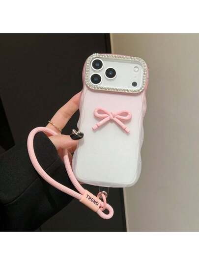 Creative High-End 3D Bow Silicone Soft Case Full Coverage For Samsung Galaxy S25 Ultra, Gradient Transparent S23 Ultra, Rhinestone Lens S22 S21 With Wrist Strap - Baby Pink - View 1