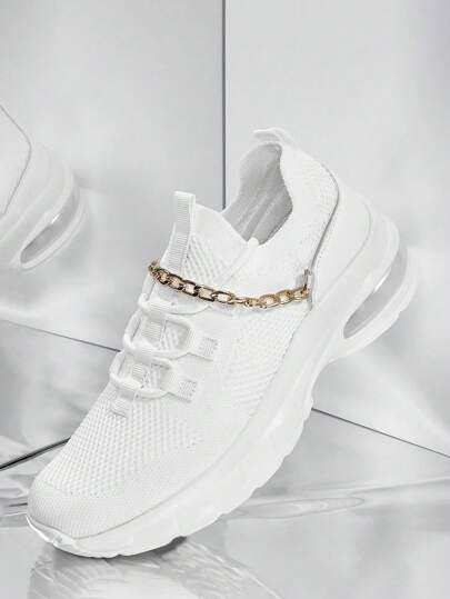 CUCCOO BASICS Chain Decor Lace Up Decor Knit Sneakers - White - View 1
