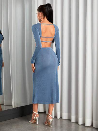 Zolique Cut Out Backless Dress Maxi Women Outfit - Dusty Blue - View 1