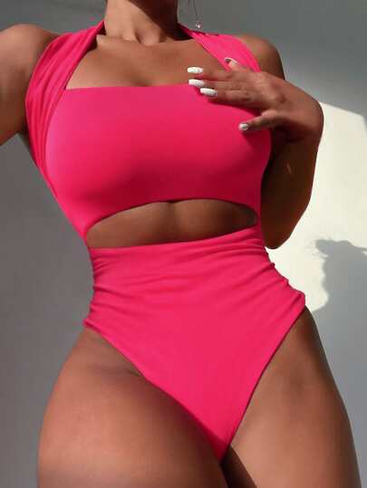 Cut Out Ruched Halter One Piece Swimsuit, For Summer Beach Vacation - Watermelon Pink - View 1