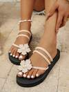 Handmade Natural Shell & Starfish Rhinestone Decorated Shoelaces, Woven Design Flat Casual Beach Sandals, Suitable For Summer Beach, Vacation, Travel, Embossed Comfortable Soft Non-Slip Flat Flip Flops For Women