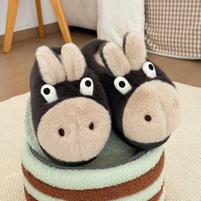 Cute Donkey Cartoon Plush Slippers, Thick Sole Indoor/Outdoor Warm Lining Funny Bedroom Slippers, Unisex Winter Couple Warm Slippers - Dark Grey - View 1