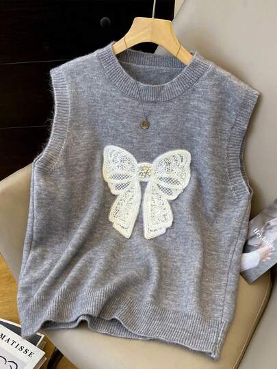 Cute Lace Embroidery Sleeveless Knit Women Vest With Bow, Round Neck Sweater Vest, Suitable For Autumn/Winter Everyday Wear - Grey - View 1