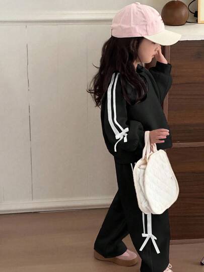 Dazy Kids 2pcs/Set Young Girls Round Neck Knitted Sweatshirt Set, Fall - Black - View 2