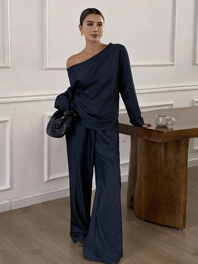 DAZY 2pcs Women Off Shoulder Long Sleeve Top And Loose Pants Set - Dark Wash - View 1