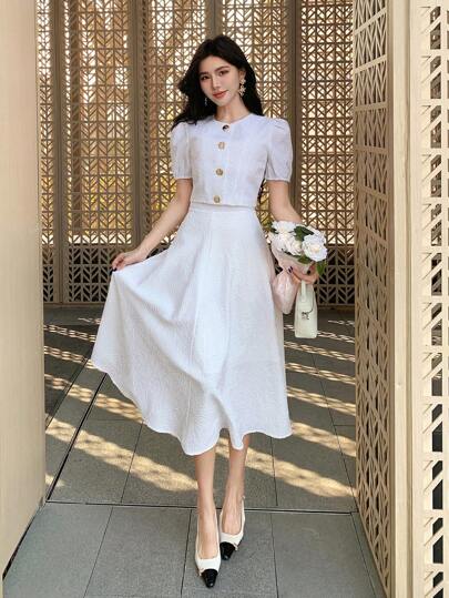 DAZY 2pcs Women Textured Fabric Short Sleeve Vest And Skirt Set - White - View 1