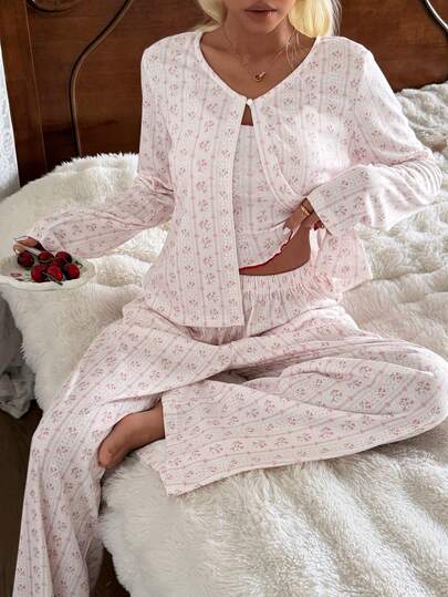 DAZY 3pcs/Set Ditsy Floral Contrast Trim Women Pajama Set - White - View 1