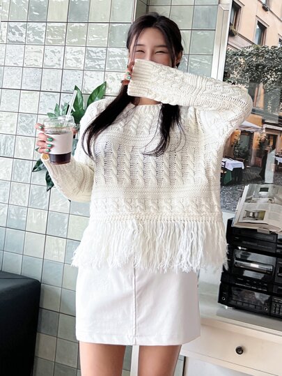 DAZY Cable Knit Fringe Hem Drop Shoulder Sweater - White - View 8