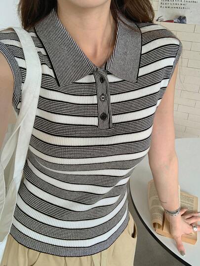 DAZY Contrast Stripe Fitted Polo Collar Casual Vacation Summer Knit Top For Women - Grey - View 6