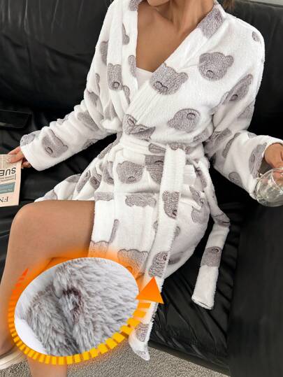 DAZY Cute Plush Bear Pattern Belted Robe Fluffy, Thermal Lined Fall, Winter, Cozy - White - View 5
