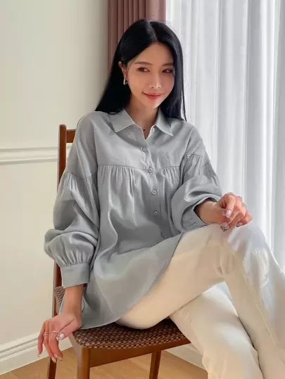 DAZY Drop Shoulder Button Front Shirt,Fall Women Clothes - Dusty Blue - View 1