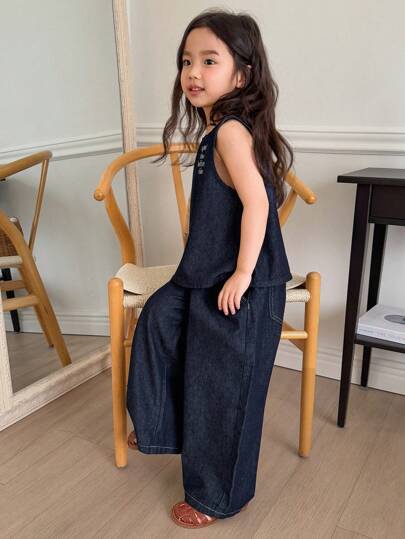 Dazy Kids Young Girl Summer Casual Letter Embroidery Denim Vest & Denim Shorts Set - Dark Wash - View 1
