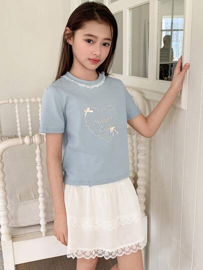 DAZY Girls Embroidered Round Neck Knit Short Sleeve T-Shirt And Skirt 2-Piece Set, Tween Girl Fall Outfit - Blue - View 1