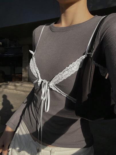 DAZY Lace Panel 2 In 1 Long Sleeve T-Shirt For Women, Spring,Fall Women Clothes - Grey - View 7