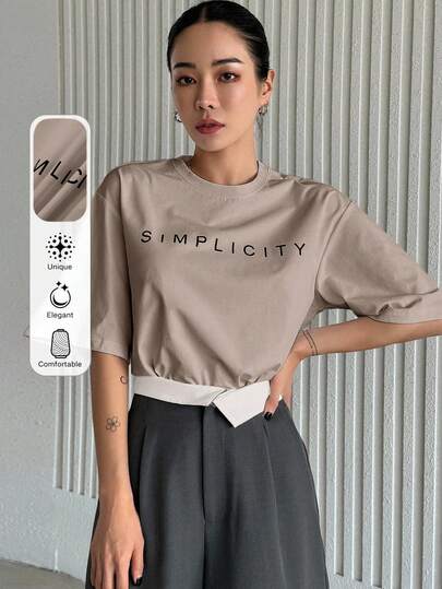 DAZY Letter Print Loose Fit Round Neck Women T-Shirt - Khaki - View 1