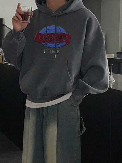 DAZY Men's Embroidered Pattern Hoodie In Grayish Blue,Fall Clothes - Grey - View 1