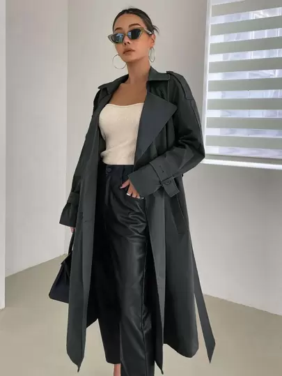 DAZY Raglan Sleeve Epaulettes Design Belted Trench Coat,Fall Clothes Women Jacket - Dusty Blue - View 1