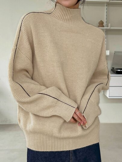 DAZY Seam Detail High Neck Drop Shoulder Sweater - Apricot - View 1