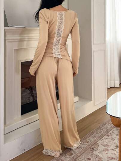 DAZY Simple Pleated Design Waist Cinching Top With Back Lace Panel & Loose Lace Panel Pajama Pants Set - Apricot - View 7