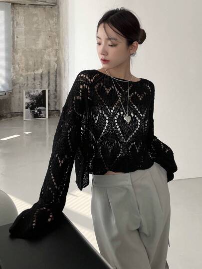 DAZY Solid Drop Shoulder Open Knit Sweater - Black - View 1