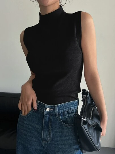 DAZY Solid Mock Neck Ribbed Knit Tank Top - Black - View 1