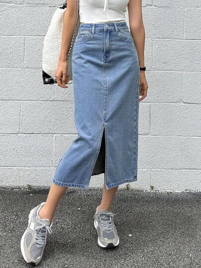 DAZY Solid Split Thigh Denim Skirt Jeans Skirt - Light Wash - View 1