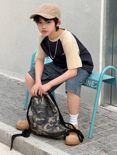 DAZY Tween Boy Letter Print Contrast Raglan Short Sleeve Casual T-Shirt - Navy Blue - View 1