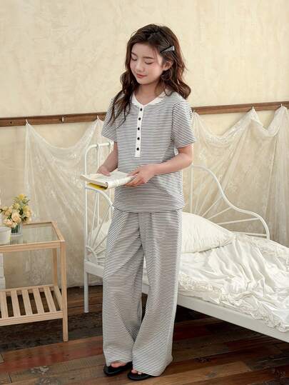 DAZY Tween Girl Striped Print Crew Neck Short Sleeve Top And Pants Pajama Set - Multicolor - View 1