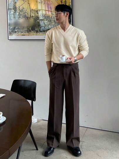 DAZY V-Neck Beige Casual Pullover Sweater For Men, Autumn - Beige - View 1