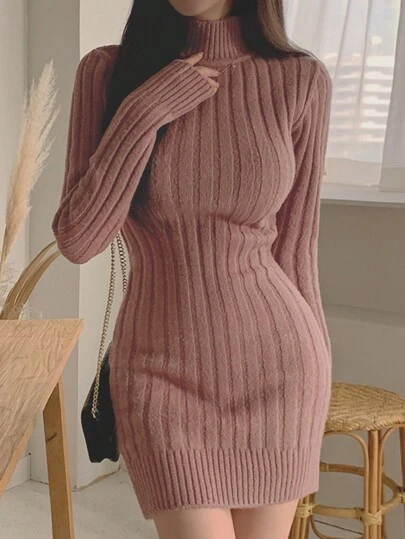 DAZY Women Ribbed Tight Knit Sweater Dress, Fall Women Clothes Turtleneck Women - Coral Pink - View 1