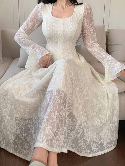 DAZY Women Square Collar Floral Lace Flared Sleeve Elegant Midi Dress - Beige - View 1