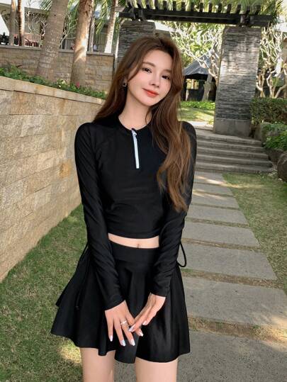 DAZY Solid Zip Through Drawstring Side Crop Rashguard Summer Beach Vacation - Black - View 1