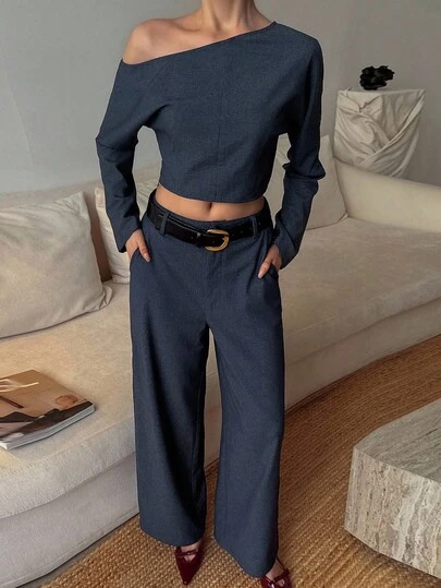 DAZY Women's Asymmetric-Shoulder Loose Cropped Denim 2 Pieces Set - Dark Wash - View 1