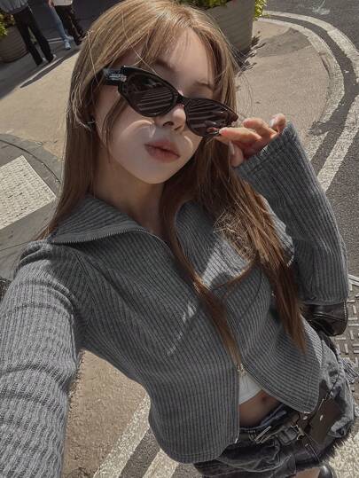 DAZY Women's Collared Zip-Up Cardigan,Long Sleeve Tops,Fall Women Clothes Jacket - Grey - View 1