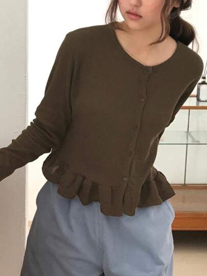 DAZY Women's Crew Neck Patchwork Ruffle Hem Long Sleeve T-Shirt, Spring/Summer,Fall Clothes - Brown - View 1