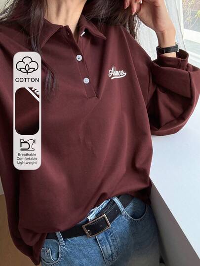 DAZY Women's Long Sleeve Polo Neck Letter Print T-Shirt, Autumn Preppy Tops,Fall Women Clothes - Burgundy - View 1