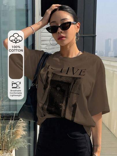 DAZY Women's Loose Fit Short Sleeve T-Shirt With Letter Print Round Neckline ACTIVE Summer,Graphic Tees - Coffee Brown - View 1