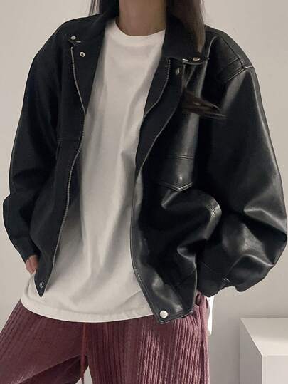 DAZY Women's Loose Fit Stand Collar Distressed Jacket,Fall Clothes Leather Jacket - Black - View 1