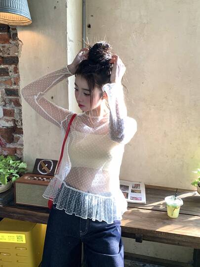 DAZY Women's Mock Neck Flocked Polka Dot Ruffle Trim Long Sleeve Blouse - White - View 1
