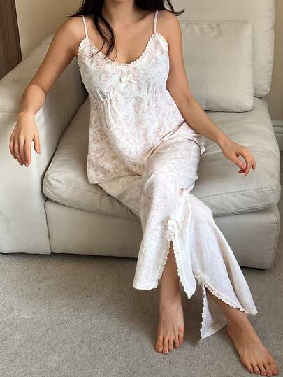 DAZY Women's Sweet Patterned Ruffle Trim Camisole & Pants Pajama Set - Beige - View 1