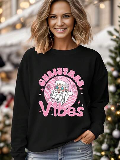 DEARCASE Pink Christmas Santa Claus Letter Graphic Print Pullover Drop Shoulder Sweatshirts for Fall & Winter - Black - View 1