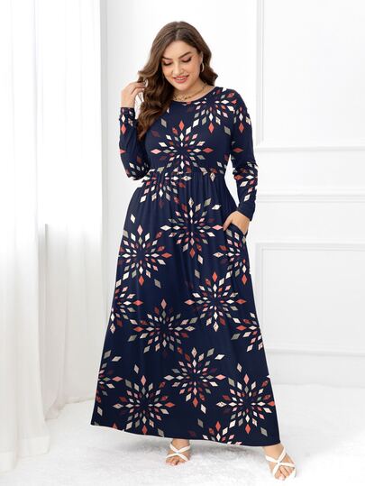 DEARCASE Plus Size Geo Print Hidden Pocket Dress - Navy Blue - View 1
