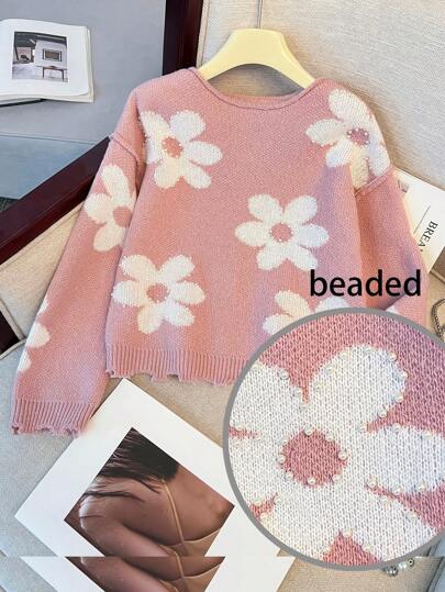 Tween Girls Pink & White Floral Jacquard Embellished Loose Raglan Sweater, Winter - Pink - View 1