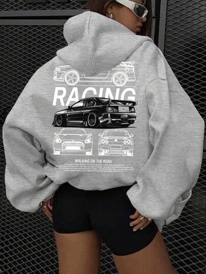 SHEIN EZwear Casual Vintage Car Graphic Print Loose Fit Hoodie Sweatshirt For Women, Suitable For Autumn/Winter - Light Grey - View 1