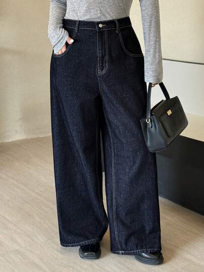 Dazy Plus Dark Wash Loose Straight Leg Business Casual Commuter Long Jeans, All Season - Dark Wash - View 1