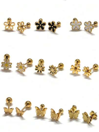 Delicate 3D Flower Earring Set, Small Stud Earrings, Fashionable, Simple, Textured Design, Suitable For Women To Wear Casually, Black, Gold, Steel Grey Tones Valentines - Multicolor - View 19
