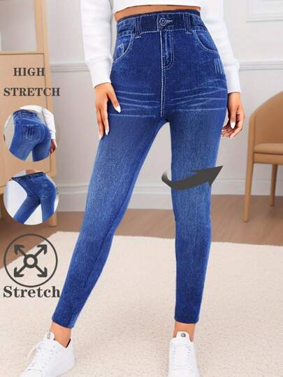 European American Fashion Simple Blue Denim Effect Elastic Waist Casual Leggings Soft Comfortable Fitness Running Sports Pants Yoga Home Exercise Outdoor Walking Skinny Cropped Tights - Blue - View 1