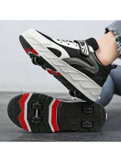 Detachable 4-Wheel Roller Skates, Lightweight & Stable All-Season Indoor/Outdoor Rollerskates, Suitable For Beginners, Training And Leisure Wear For Boys And Girls - Fashionable PU/Fabric Upper, Wavy Sole And Colorful Wheels Design - All-Weather Suitable - Easy On And Off, Roller Sports Shoes - Black - View 1