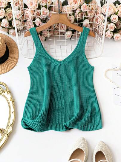 SHEIN LUNE Plus Size Solid Color Casual Tank Top Knitted Blouse, Suitable For Summer - Green - View 1