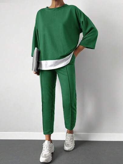 Drop Shoulder 2 In 1 Tee & Seam Detail Pants - Green - View 5